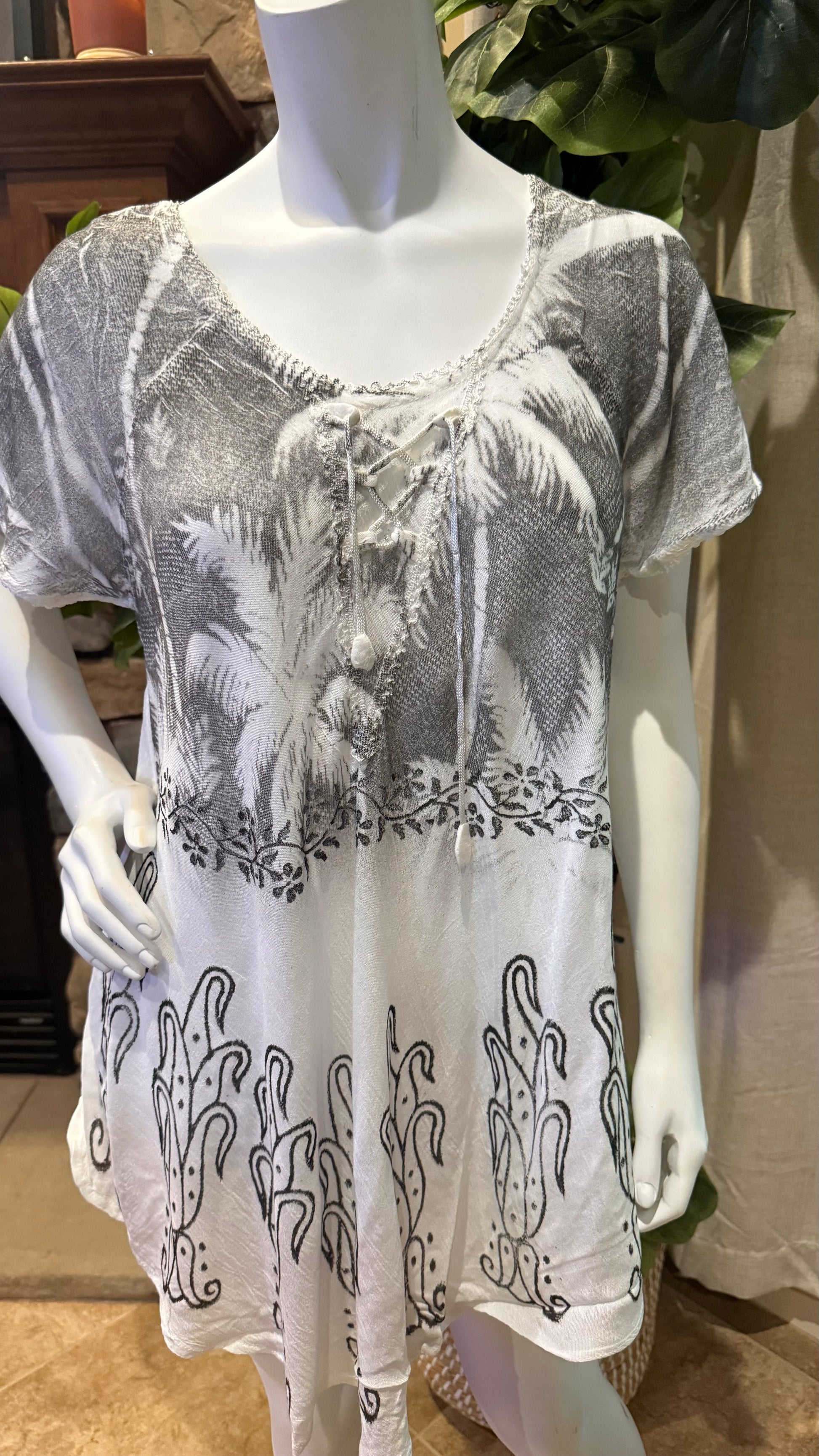 This very versatile piece can be worn as a top or short dress. It’s multi functional and perfect for any outing. It’s a one size fits small to X large. This is one top/ dress that I would include in my suitcase. Very light and airy, and artistically colorful. It’s embellished with embroidered flowers and hand painted details. Truly not just a dress but art.